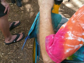 Hammerhead (the green-winged macaw) is a big softie, but he doesn't like women.