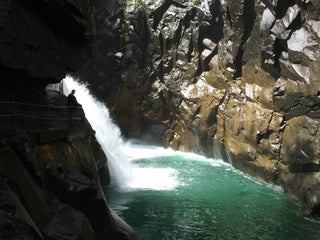 To see the waterfall go through restaurant