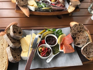 The wine tasting is free. Try the chicken & cranberry filo is great!