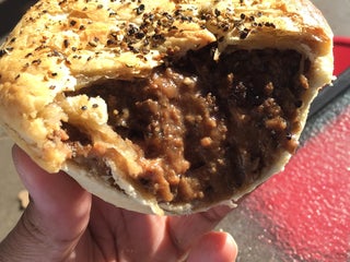 The pies have soft chunky steak pieces, but are pretty saucy and cost about $6.