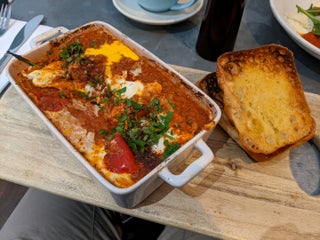Everything. The shakshouka special is a constant for me, but the food and coffee is always great. Pastries and cakes are great as an extra or to take away