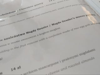 Zurek is very tasty. Duck meat is so gentle that melts in the mouth. But hot chocolate was strange experience: first day it was 100% cacao drink and on next day it was thick and served with a spoon.