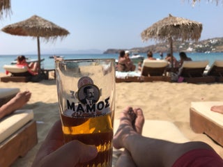 The most croweded place on the beach. For young people mostly! Easy 2find seats before 14:00. Dog frendly. Poor wifi but full 3G. Coffee: 2.5€ umbrella&2seats: 6€ Food only from inside place.