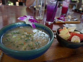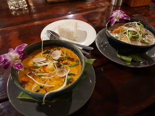 Known for it's Massaman curry & homemade coconut ice cream. Both excellent. We also had morning glory greens swimming in delicious garlic sauce & pork larb. Beautiful setting over a secluded lagoon.