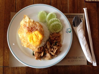นอกจากอาหารเช้าจะมีขนมปัง ไข่ดาว ไส้กรอก แฮมแล้ว ยังมีก๋วยเตี๋ยวใหัด้วย ค่องคอแต่เช้า บรรยกาศของห้องอาหารโล่งโปร่ง มีโซนนั่งสูบบุหรี่ด้านนอกด้วย