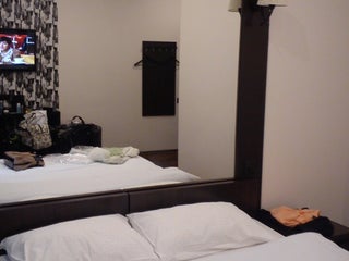 В закоулке,на первом этаже автомойка,номера маленькие,обещают Wi-Fi и завтраки