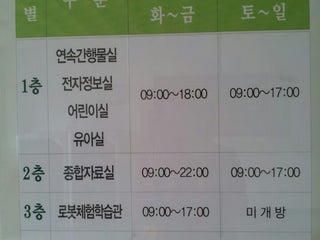 매주 월, 공휴일 휴관.종합자료실 평일:09시~22시, 주말:9시~17시어린이실 평일:9시~18시, 주말:9시~18시