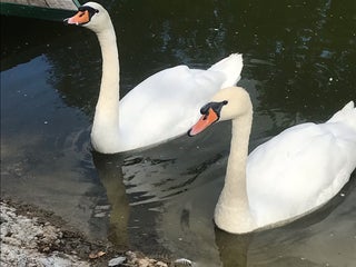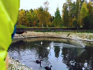 Прекрасные черные и белые лебеди в пруду. Но корм покупать нет смысла, он им совсем не интересен и сразу тонет;)