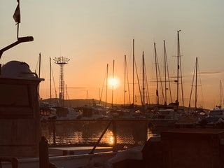 A lot of beautiful yachts. Nice sea view during sunset.