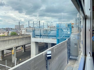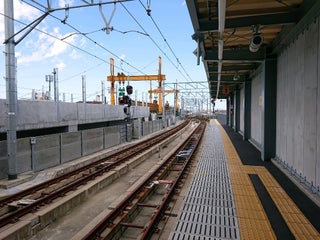 路面電車が高架橋の上を走る珍しい光景が見られます